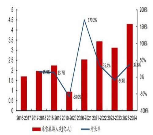 从行业视角来看,自2015年北京成功申办2022年冬奥会以来,中国冰雪产业进入了快速发展阶段。中国旅游研究院统计数据显示,2023-2024雪季是“后冬奥时期”首个完整的冰雪旅游季,该雪季国内冰雪休闲旅游人数达到了 4.3 亿人次,创下新高。