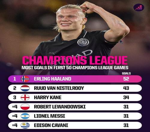 在与摩纳哥的欧冠联赛阶段第二轮比赛中,哈兰德在欧冠生涯第50次出场中上演梅开二度,至此,哈兰德欧冠生涯已打入52球,他是欧冠历史上前50场进球最多的球员,比第二多的范尼多了9球。