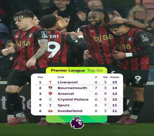 在首轮客场2-4不敌利物浦后,伯恩茅斯在接下来的六轮英超中取得四胜两平的不败战绩,在先赛一场的情况下,以14分仅次于卫冕冠军利物浦位列积分榜次席。