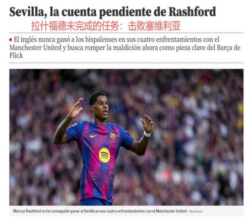 10月5日22点15分,西甲第8轮,巴萨客场挑战塞维利亚。《世界体育报》赛前撰文指出,27岁的拉什福德,迎来复仇的绝佳机会:过去4次对阵塞维利亚,(在曼联效力时期)拉师傅未尝胜绩,一球未进。